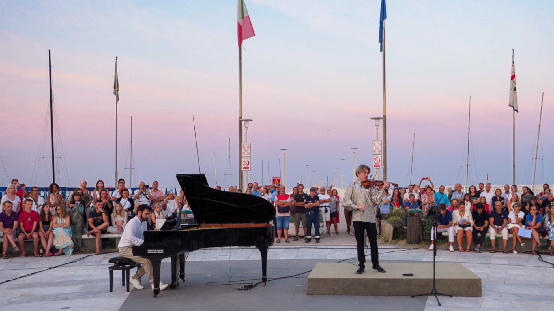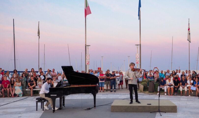 Uno spettacolo nello spettacolo che ha visto esibirsi alle prime luci dell’alba nel magnifico scenario della piazza del Pontile, il violinista Yury Revich, virtuoso interprete internazionale della musica, accompagnato al pianoforte del maestro Cesare Goretta.