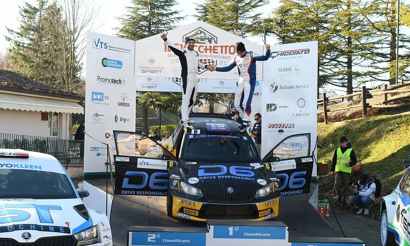 Il fiorentino Tommaso Ciuffi ha guidato per le due tappe del 30° Ciocchetto Event, suo padre Paolo ha fatto da estemporaneo navigatore, pur senza dettare le note. Hanno dominato, dall’inizio alla fine, con la Skoda Fabia R5 Balbosca, gommata Pirelli, ma per l’Albo d’Oro del Ciocchetto e per gli annali della gara resterà scritto che la vittoria va a Paolo Ciuffi, iscritto come primo conduttore, mentre Tommaso rimarrà nella memoria storica come navigatore. La norma prevede di poter invertire i due conduttori fino al momento delle verifiche pre-gara. I Ciuffi non lo hanno fatto, in quanto pensavano di alternarsi alla guida. “Poi però – raccontava babbo Paolo – quando ho visto guidare Tommaso, mi sono talmente emozionato e “gasato” a vederlo pilotare così bene, che gli ho lasciato il volante per tutta la gara”. Fatto sta che Tommaso Ciuffi, uno dei giovani piloti più veloci, terzo assoluto nel Campionato Italiano Rally 2021, si consola, con il secondo trofeo in bacheca (il primo lo ha vinto, navigando davvero papà Paolo, nel 2017) alla memoria di Maurizio Perissinot, padre di questa gara, destinato al navigatore primo classificato e consegnato da Serena Perissinot, che non manca mai a questo appuntamento”, mentre Paolo Ciuffi segna nell’Albo d’Oro il quinto successo al Ciocchetto, confermandosi sempre più recordman di vittorie.